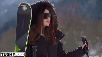 Темноволосая красотка на горнолыжном курорте флиртует с молодм человеком. Она приглашает его в номер и радевает его. Девушка доминирует и постоянно оказывается сверху. Она киской садится на член и скачет на нем продолжительное время, поворачиваясь к парню то попкой, то роскошной грудью.