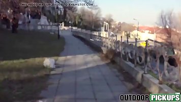 Красотка на природе от первого лица показывает большие дойки с мокрой киской