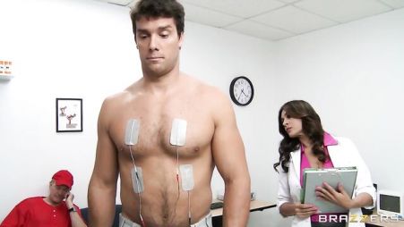 Накаченный и симпатичный самец пришел на прием к врачу, чтобы понять, от чего у него такая слабость в последнее время. Как только опытная докторша в белом халате провела осмотр, то пришла к выводу, чтобы этому мачо просто-напросто не хватает ярких эмоций. Именно поэтому она прописала ему срочный секс. А поскольку девушки у него не было, то докторша с большими дойками решила сама с ним секс-терапию провести. Опытная баба сделала пациенту такой минет, что ему уже стало лучше. А после они анальным сексом занялись.