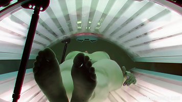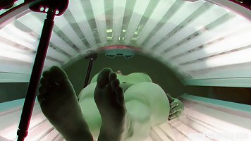 Голая телочка ласкает свое обнаженное тело в солярии крупным планом
