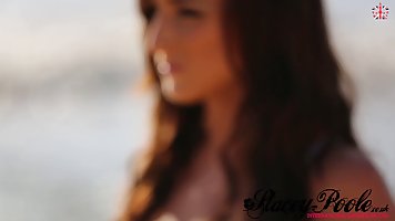 Классная брюнетка раздевается на пляже и сексуально мнет свои большие сиськи
