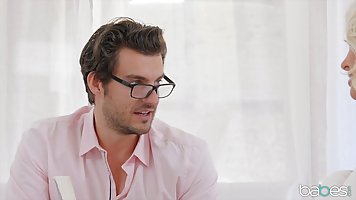 Белобрысая женщина с большими сиськами в чулках, удовлетворяет своего молодого брюнета в очках. Она показала ему киску, после подставила ее для кунилингуса, да и от вагинального секса эта бестия не откажется. Она уже прогнулась раком, раздвинула ноги и впускает вовнутрь твердый болт.