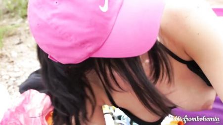В выходной день, устав от городской суеты парень с девушкой решили отправиться за город, чтобы время на природе провести и свежим воздухом насладиться. Молодая брюнетка специально с собой плед захватила. Парень наивно предполагал, что подруга и бутерброды с собой взяла, чтобы пикник устроить на природе, но у телочки с большой жопой были другие планы. У реки они удобно расположились на плене и девушка начала своего бойфренда минетом баловать. А после куни впустила его крепкий ствол для секса на природе.
