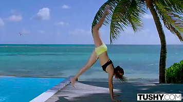 Молоденькая девушка у бассейна позволяет лысому мужчине ласкать ее тело и ласкать языком промежность. Молодуха раздвинула ноги и выставила тугую попку для реального анального секса. После куни, мужчина достал член, трахнул красотку в ротик и засадил болт в узенькую задницу, разрабатывая ее толчками.