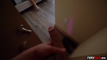 Похотливый парень подсматривает за зрелой теткой, которая сидит на кровати и разговаривает по телефону. Развратник так возбужден, что решает достать член и начинает его надрачивать. Через минуту мачо входит в комнату и заставляет зрелку взять залупу в руку и в рот.