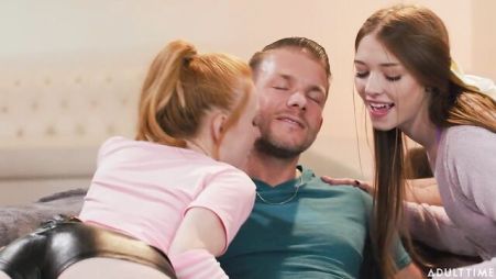 Втроем на все выходные они остались дома, а родители отправились в гости. Теперь очаровательные девушки решили воспользоваться ситуацией и попробовать член своего сводного брата, о чем они мечтали очень давно. Парень был в шоке от того, чтоб две сводные сестры так откровенно начали к нему приставать. С двух сторон очаровательные девушки начали ствол своего брата ласкать и делать минет по очереди. Как только большой ствол парня был готов к работе, то они устроили секс втроем, подставляя свои дырочки.