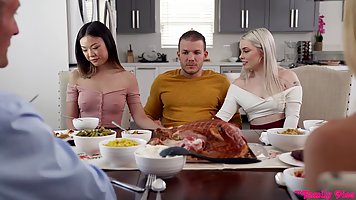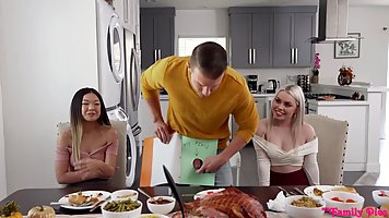 Сводный брат в честь праздника сестрам преподнес необычный подарок - он подарил им свой член. После семейного обеда похотливые сестрички решили своим подарком по полной программе воспользоваться. Уединившись со сводным братом в комнате, телочки устроили секс втроем и получили по оргазму.